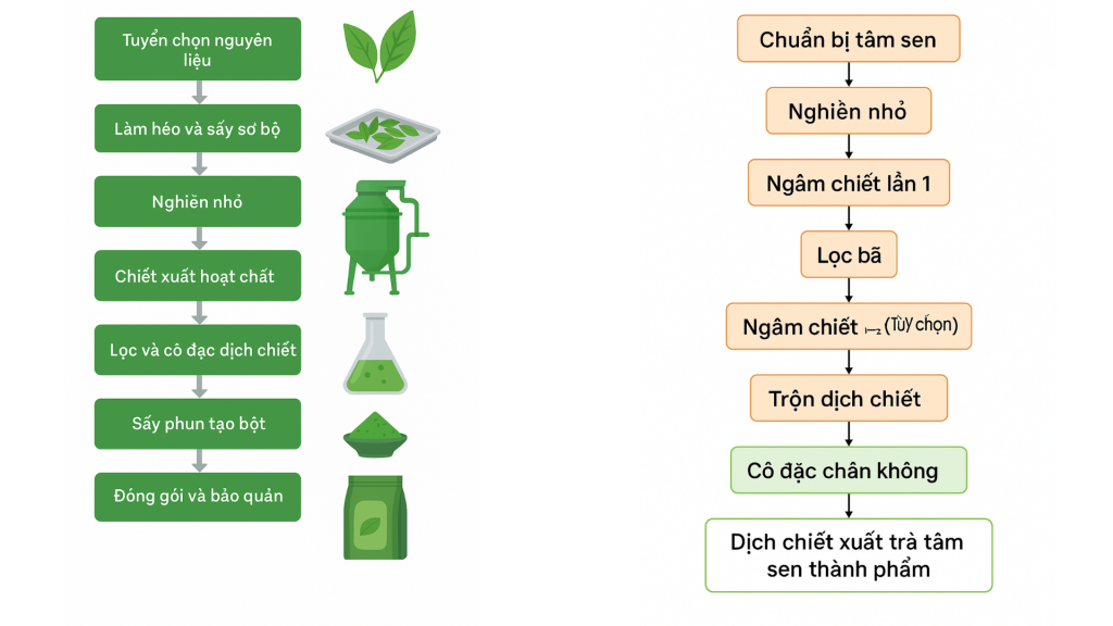 Quy trình sản xuất tóm gọn sơ đồ chiết xuất dạng bột và chiết xuất dạng lỏng